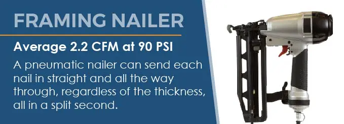 Framing nailers require air pressures of an average of 2.2 CFM at 90 PSI.