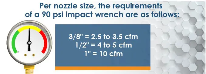 Impact wrenches require air pressures of an average of 2.5-3.5 (3/8″), 4-5 (1/2″), 10 (1″) CFM at 90 PSI.