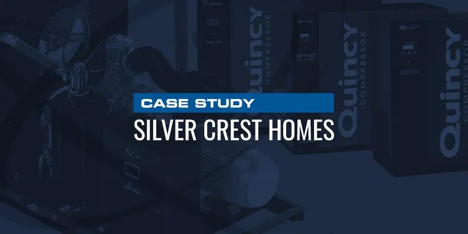 This is where Quincy Compressor came in. We wanted to help Silver Crest Homes improve their reliability and energy efficiency by introducing energy-efficient air compressors. We performed leak detection and identified 293 CFM of artificial demand amongst accessible leaks in hoses, piping and machinery fittings. Based on production pressure, we calculated that leaks were causing an annual energy consumption of $21,675.