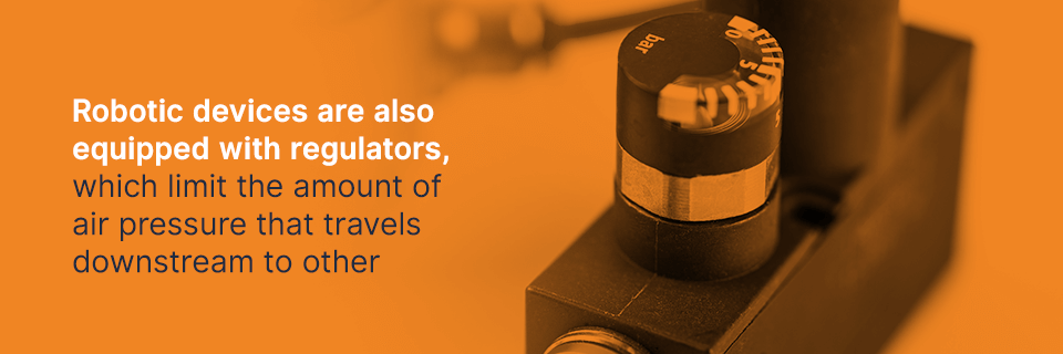 Robotic devices are also equipped with regulators, which limit the amount of air pressure that travels downstream to other components. This way, you can control the amount of pressure that gets sent to each part of a robot. If one area requires more pressure than another, you can have each piece regulated at different levels. For example, if one arm is required to lift heavier objects and move at twice the speed of other arms, that arm can be programmed to receive higher levels of pressure than the other components. With regulators in place, each robotic device can perform a wider range of different functions.