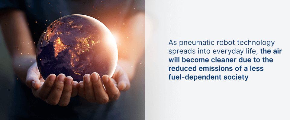 As pneumatic robot technology spreads into everyday life, the air will become cleaner due to the reduced emissions of a less fuel-dependent society. The spread of pneumatic power in the realm of automation and transportation will largely reduce America’s dependence on foreign oil and the need to drill.